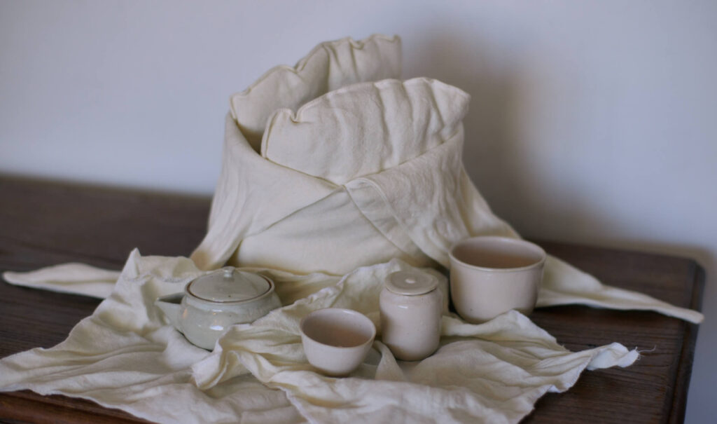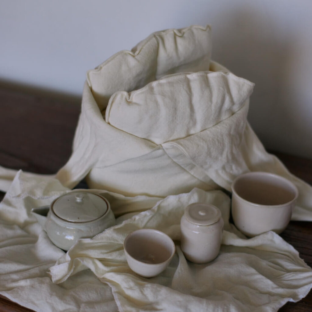 THE CONRAN SHOP代官山店の企画で作った、煎茶・抹茶用の茶箱《団 dan》。大分県日田市で作陶を続ける三笘修さんが手がけた、実用性と美しさを兼ね備えた釉薬の茶器を、ふとん職人の丹羽拓也さんが手がける、やわらかな布に包まれたような特製の箱に収めています。出張先にも持っていけるのですごく重宝しています。